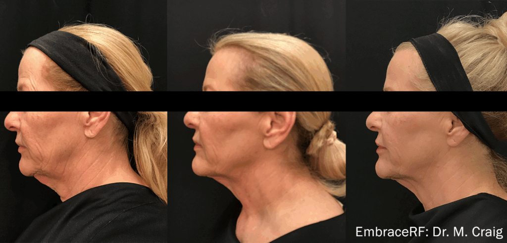 Потеря упругости кожи, птоз тканей также являются показаниями для проведения процедуры. Радиочастотная энергия вызывает сокращение коллагеновых волокон, что приводит к подтяжке кожи и уменьшению провисания тканей в области щек, подбородка, шеи.